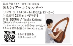 「歌とライアー 小さなコンサート」についてのお申し込みは、もみの木音楽舎(梶谷)へご連絡くださいませ。